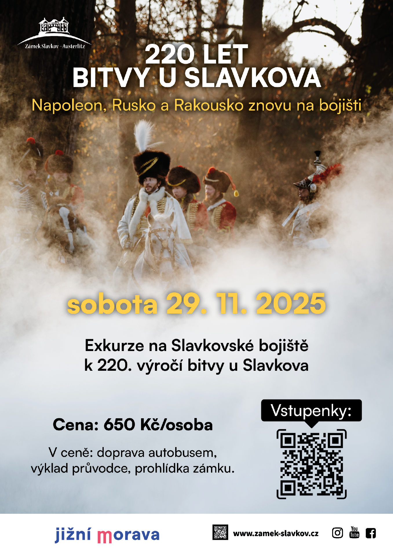 Zveme všechny milovníky historie, vojenské taktiky i krás jižní Moravy na mimořádnou exkurzi k 220. výročí bitvy u Slavkova – Bitvy tří císařů! Čeká vás nezapomenutelný den plný historie, atmosféry a zážitků, které oživí jednu z nejznámějších událostí evropských dějin.