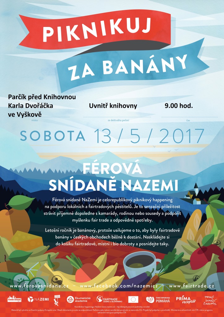 V sobotu 13. května se ve Vyškově uskuteční piknikový happening na podporu fairtradových a lokálních pěstitelů - Férová snídaně NaZemi. Proběhne od 9.00 h. v parčíku před Knihovnou Karla Dvořáčka (v případě deště uvnitř knihovny). Vyškov se tak přidá k více než stovce míst, kde se ve stejný čas sejdou tisíce lidí, aby vyjádřily svůj zájem o pěstitele a pěstitelky, jejichž plodiny se dostávají na náš stůl. Akce se koná v Česku již posedmé, a to vždy na Světový den pro fair trade, který se slaví každoročně druhou květnovou sobotu. Ve Vyškově proběhne po páté.